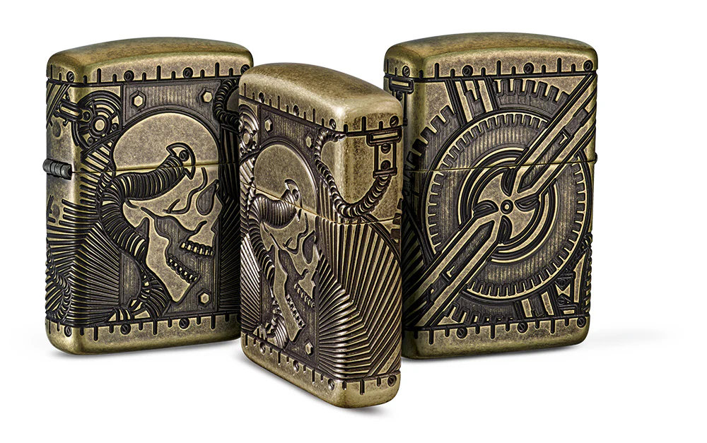 This Armor® Antique Brass shows off a 360° MultiCut engraving process that allows engraving to the edge, over the edge, and around the entire lighter. An antique brass finish accentuates the high and low weathered look of the steampunk design.