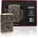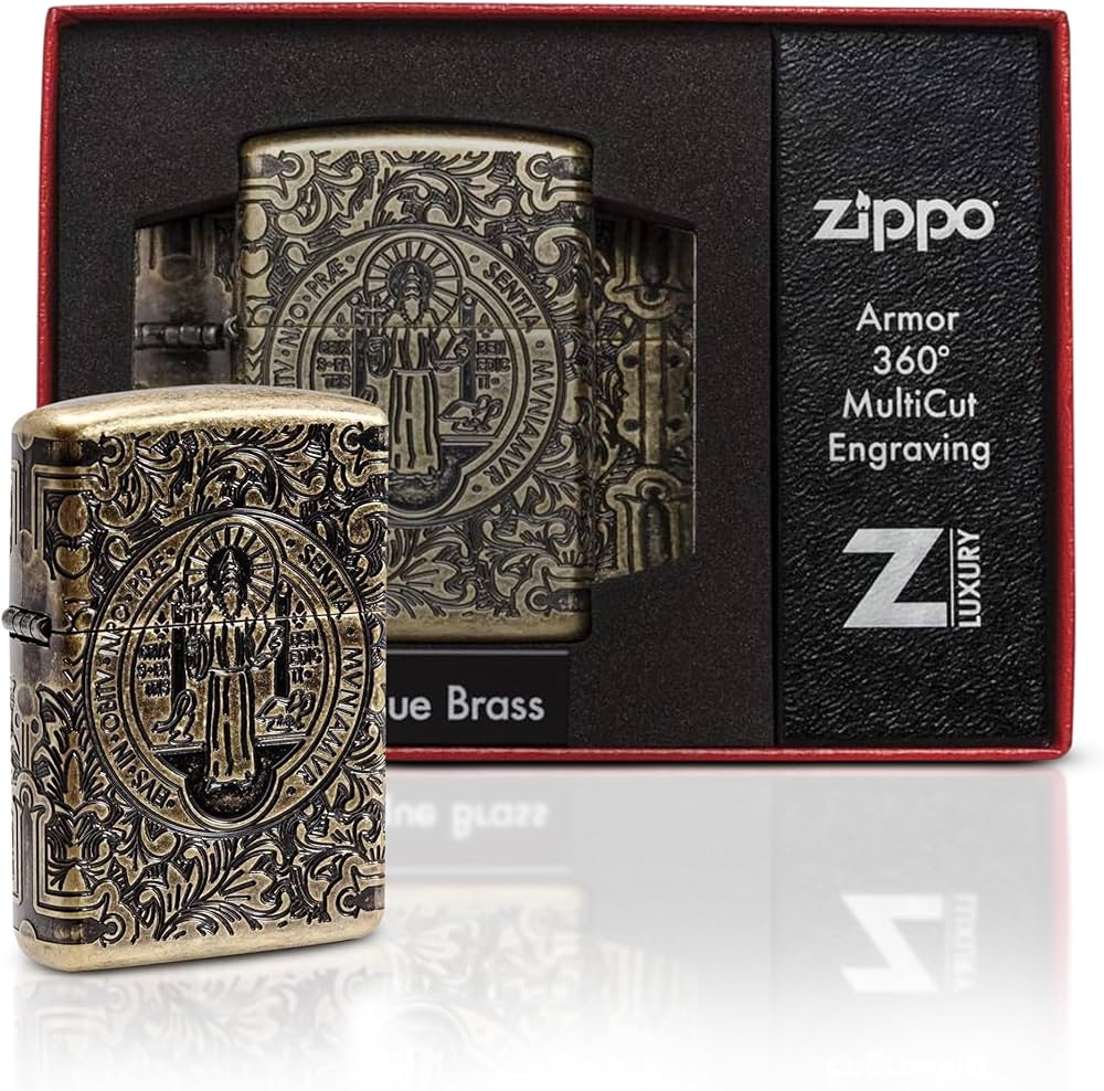 Zippo releases the #1 globally requested design to an eager worldwide audience as part of the Zippo in Film Tribute series. Bearing the medal and cross of St. Benedict and surrounded by scrolling flourishes that envelop the entire surface of the lighter. Using Zippo's 360° MultiCut engraving process on an Armor® Antique Brass finish lighter. This design was inspired by the Zippo lighter that had a silver screen role as a tool to help stave off Hell on Earth. Comes packaged in a luxury box. For optimal performance, fill with Zippo lighter fuel.