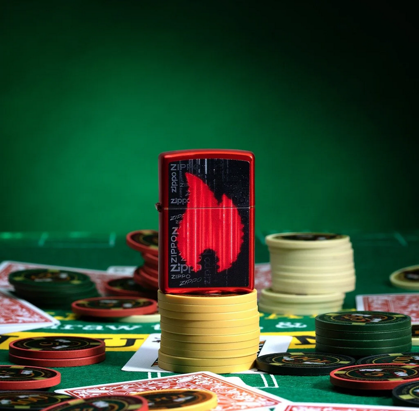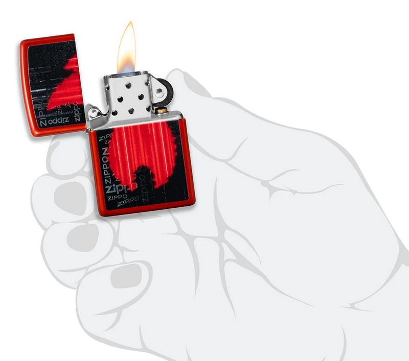The eternal flame represents the heritage and foundation of the Zippo Windproof lighter. Revealing from a coat of black is the eternal flame, which is perfectly complemented in a brilliant red tone and paired with a Metallic Red model. Completing this color image design is an array of Zippo logos from the past and present.