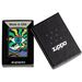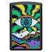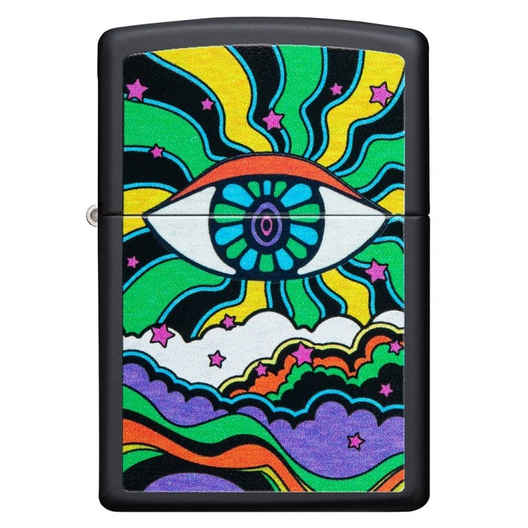 I nuovi disegni a luce nera sono realizzati utilizzando un inchiostro appositamente formulato, che viene applicato con cura per selezionare aree dell'arte dell'immagine a colori in modo che quando il disegno è esposto alla luce ultravioletta (nota anche come luce UV o nera) appaia un bagliore bluastro sull'area selezionata. Questo design presenta l'Occhio Onniveggente che emette linee dai colori psichedelici. Viene confezionato in una confezione regalo. Per prestazioni ottimali, riempire con carburante per accendini Zippo.