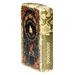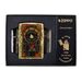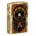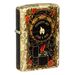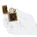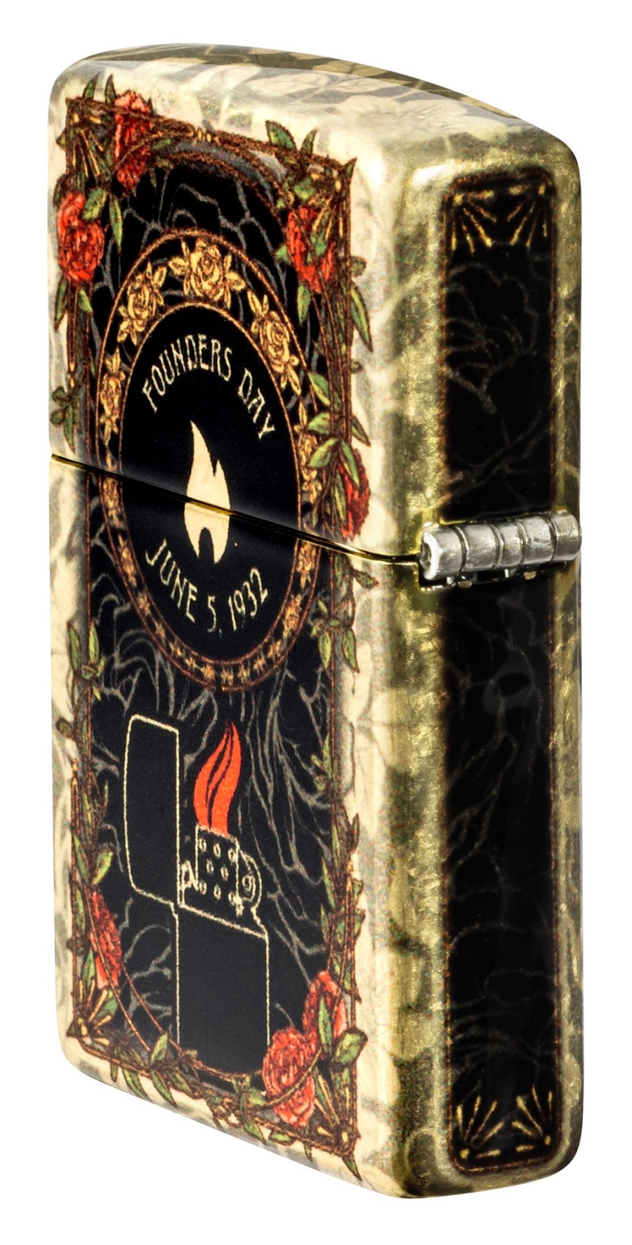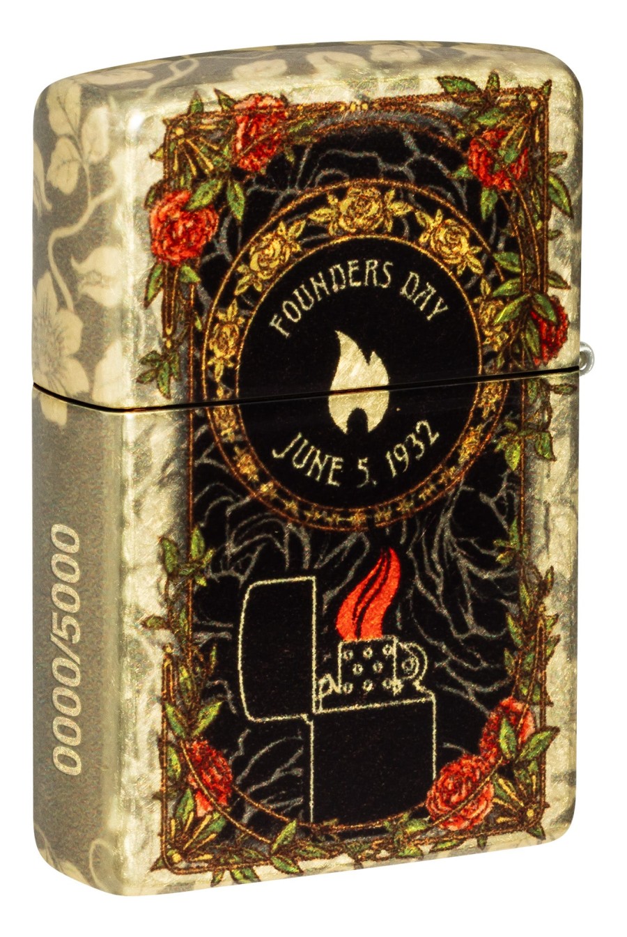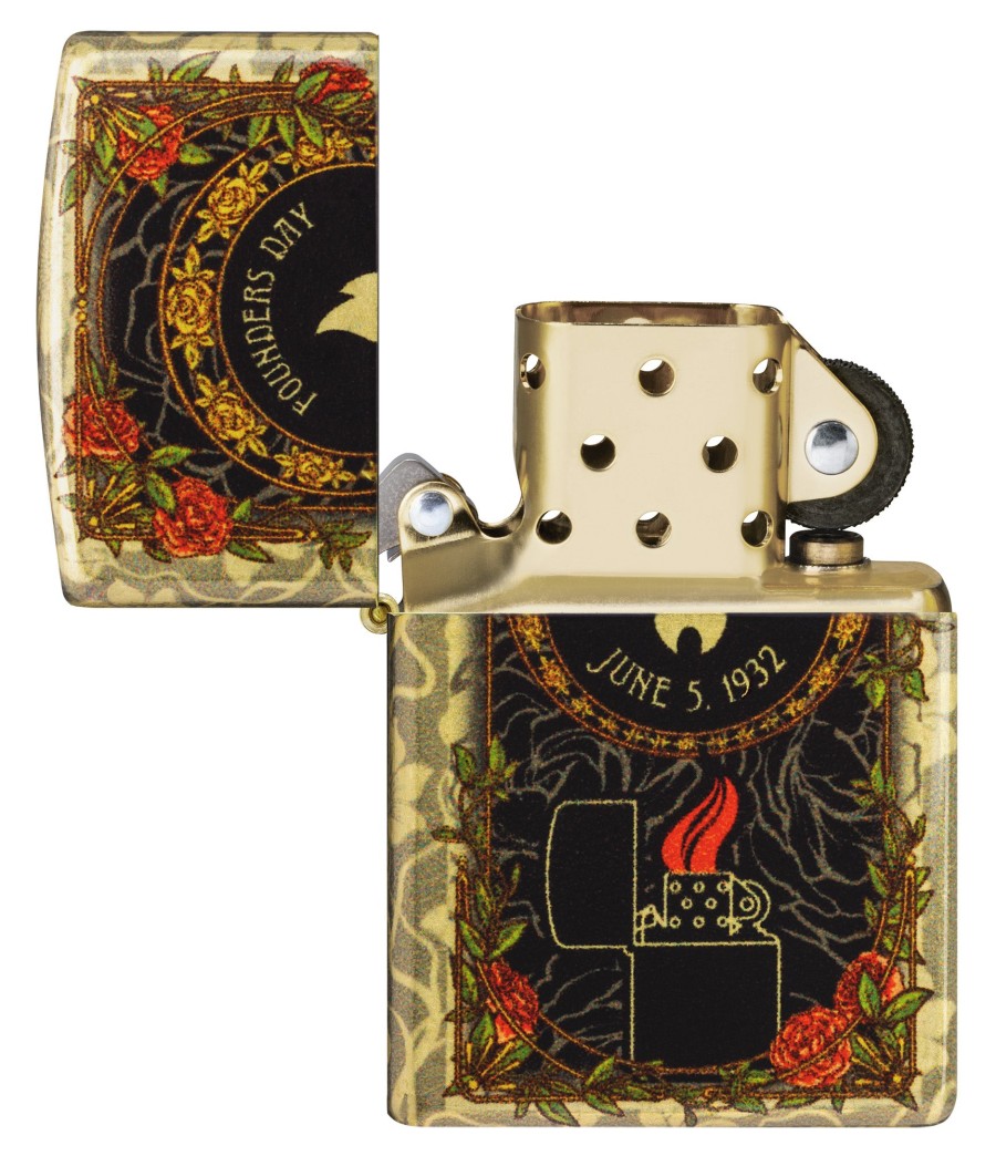 Fioriture fluide, che ricordano lo stile Art Nouveau, avvolgono ogni superficie dell’oggetto in un design incentrato su uno stemma del Founder’s Day inciso con la data di nascita del signor Blaisdell e l’anno di fondazione di Zippo. Un accendino antivento fiammeggiante caratterizza il design, che è specchiato sul retro e incorpora le scintillanti tonalità Tumbled Brass della cassa dell’accendino per una maggiore profondità.